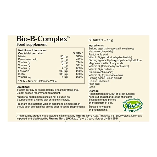 Pharma Nord Bio-B-Complex is a premium Danish vitamin B complex supplement containing a balanced combination of essential B vitamins to support normal energy release, mental performance and nervous system function. B vitamins play a key role in helping the body convert food into usable energy while supporting overall wellbeing and reducing tiredness and fatigue.