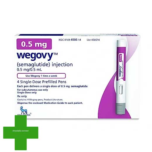 Wegovy 0.5mg is a once-weekly injectable treatment used to support weight loss and management in adults with obesity or who are overweight with medical complications. It contains semaglutide, a GLP-1 receptor agonist that mimics natural hormones to reduce appetite, regulate eating, and support a calorie-controlled lifestyle.